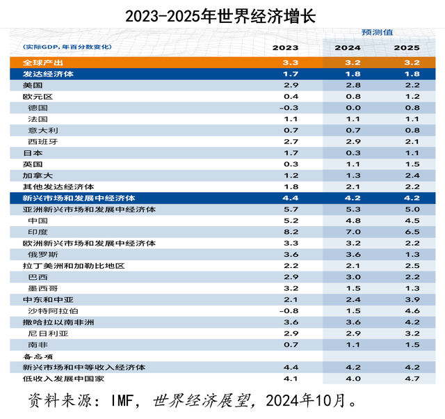 在2024年10月22日发布的 《世界经济展望》 中,国际货币基金组织预计,2025年的全球经济增速将稳定在3.2%,与2024年持平,虽然整体经济态势稳健,但全球经济前景仍面临诸多不确定性,部分地区和行业正面临增速放缓的潜在风险。
