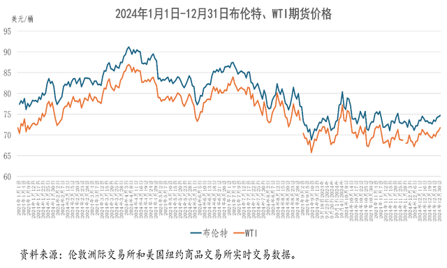 2024年,布伦特原油期货价格均价为79.77美元/桶,比2023年的82.16美元/桶,每桶下跌了2.39美元,跌幅为2.9%;WTI期货价格均价为75.72美元/桶,比2023年的77.57美元/桶,每桶下跌了1.85美元,跌幅为2.38%。