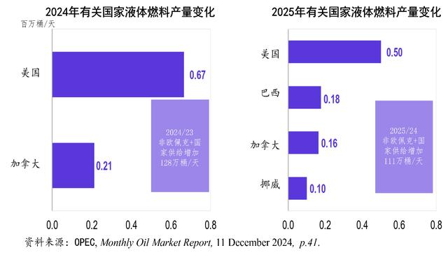 在2024年12月11日发布的《月度石油市场报告》中,对于2025年的世界石油供给,欧佩克认为,非欧佩克石油生产国的石油产量将增加110万桶/天,总量将达到5420万桶,比2024年增长2.08%。其中,美国石油产量将每天增加50万桶,增长2.31%,总量将超过2210万桶/天,其中原油和凝析油产量为1350万桶/天;加拿大石油产量将每天增加20万桶/天,总量将达到610万桶/天;挪威的石油产量将每天增加10万桶/天,总量将达到210万桶/天。