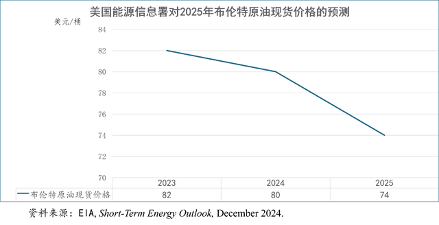 在2024年12月10日发布的《短期能源展望》报告中,美国能源信息署预测,2025年布伦特原油现货均价为74美元/桶,比2024年每桶下降6美元。2025年第一季度,布伦特原油现货价格为74美元/桶,而第四季度将下降到72美元/桶。